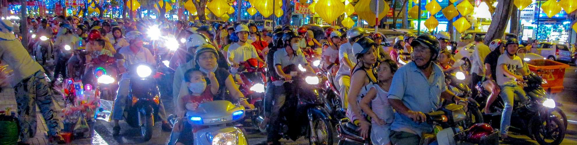 Liikenne oli kaaosmainen, taksin kyydissä sitä katseltiin ja kauhisteltiin. Mopoilijoita tuhansittain ja kyydissä olijoita vielä enemmän. Viisi yhdessä mopossa oli ihan tavallinen näky. Juuri silloin oli tullut mopoilijoiden kypärä pakolliseksi. Aikaisemmin oli pakollinen vain ”moottoriteillä”. Siellä oli vakiopaikat, missä poliisit sakottivat kypärämättömiä. Mutta ennen ratsiapaikkaa oli kypärävuokraamo ja sakkopaikan jälkeen palautus. Kypärät maksoivat vain yhden euron, eikä varmasti suojelleet juuri lainkaan.