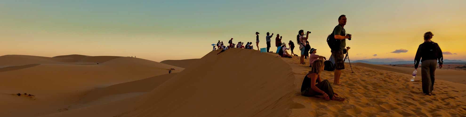 Jeeppi kurvaili dyynien reunalle, josta kävelimme pehmeässä hiekassa mäen laelle odottamaan nousua. Emme olleet siellä yksin, kymmenet muutkin olivat kiinnostuneet uudesta aamusta. Oli yllättävää, että lähellä oli tällainen hiekkaerämaa. Lähtiessä kävimme katsomassa pientä lampea, jossa kukki upeat lootuskukat ja veneessä vanha mies ongella.